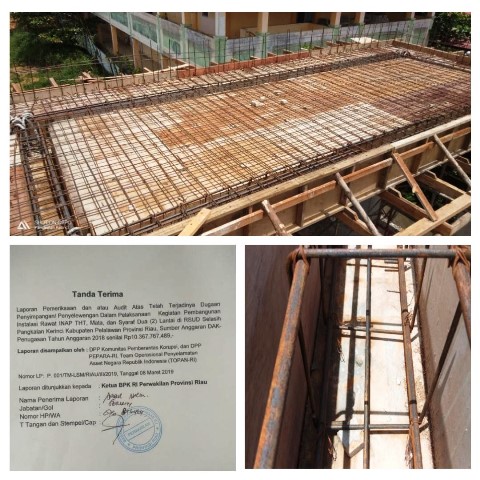 Riau, (WRC) – Badan Pemeriksaan (BPK) RI Perwakilan Provinsi Riau, pada hari Jum’at (08/03/19), menerima laporan permintaan pemeriksaan dan/atau audit dugaan penyimpangan dana APBN melalui anggaran DAK-Penugasan terhadap pelaksanaan kegiatan pembangunan Instalasi Rawat INAP THT, Mata, dan Syaraf dua (2) lantai di RSUD Selasih Pangkalan Kerinci Kabupaten Pelalawan Provinsi Riau tahun 2018.