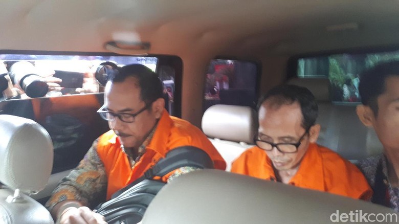 Pantauan detikcom di gedung KPK, Jalan Kuningan Persada, Jakarta, Sabtu (16/3/2019), Muhammad Muafaq Wirahadi dan Haris Hasanuddin mengenakan rompi oranye dan tangan diborgol. Keduanya langsung menuju mobil tahanan KPK.