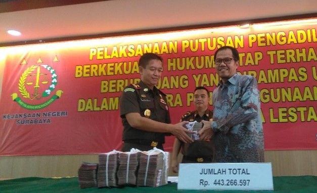 Surabaya, (WRC) – Kejari Surabaya menyerahkan uang sebesar Rp 443.266.597,00 kepada Lembaga Pengelola Dana Bergilir (LPDB) Kementerian Keuangan dan UMKM. Dana tersebut dikumpulkan dari empat terdakwa kasus korupsi.