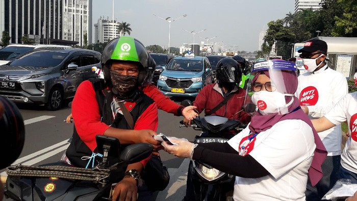 Jakarta – Wakil Ketua Komisi Pemberantasan Korupsi (KPK) Lili Pintauli Siregar membagi-bagikan masker ke pengendara yang melintas di Jalan Jenderal Sudirman, Jakarta Pusat, pagi ini. Lili meminta pengendara taat mengenakan masker.