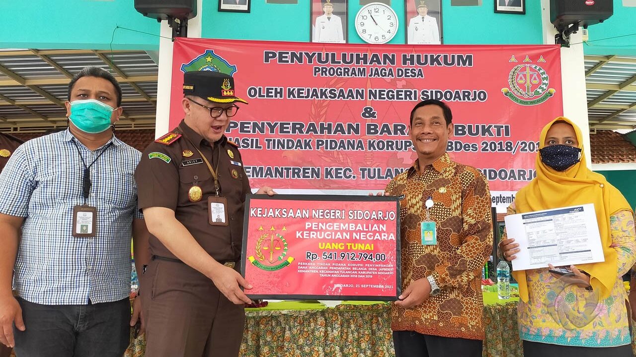 “Sesuai keputusan pengadilan Tipikor Surabaya, hari ini kami mengembalikan uang kerugian negara. Sebesar Rp 531.912.794 ke penjabat Kades Desa Kemantren yang baru,” ujar Kajari Sidoarjo Arief Zahrulyani di Balai Desa Kemantren, Tulangan, Selasa (21/9/2021).